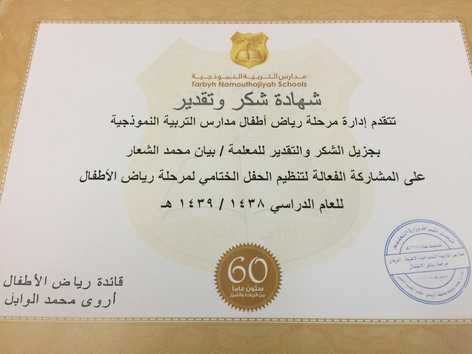 شهادات الشكر والتقدير للأعوام السابقة ملف الإنجاز الإلكتروني للمعلمة وفاء المغامسي