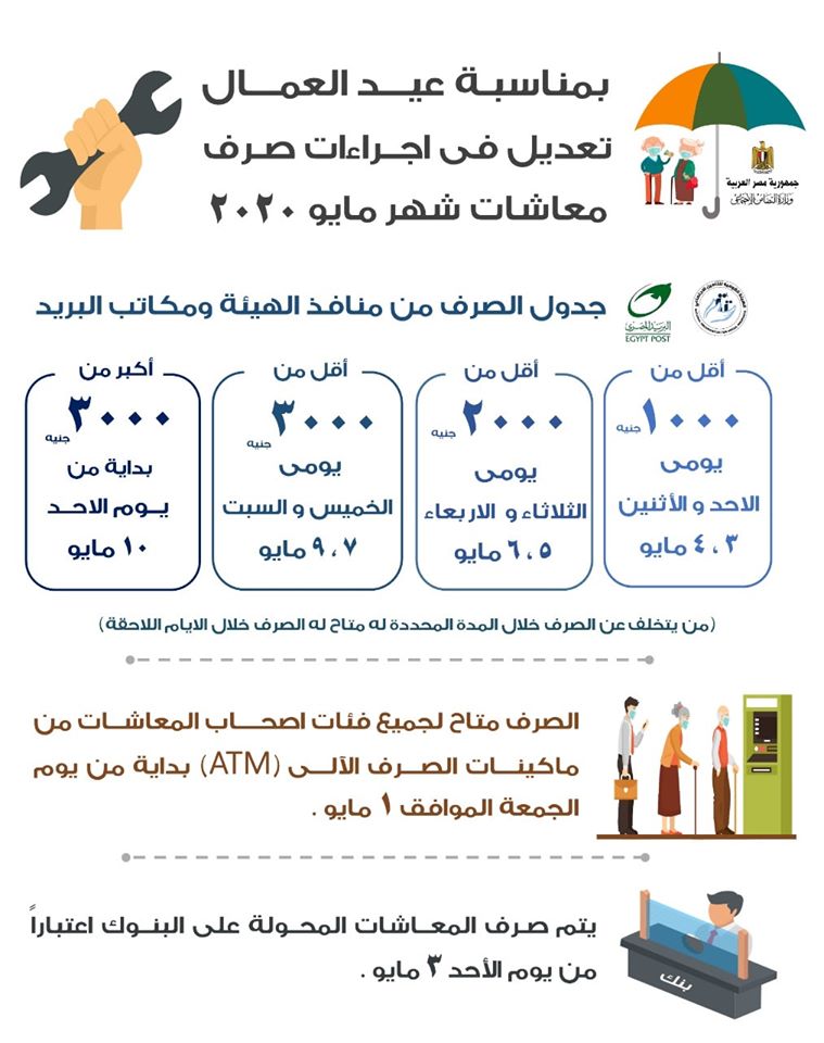 بمناسبة عيد العمال تعديل مواعيد صـرف معاشات شهر مايو اخبار الكنيسة القبطية