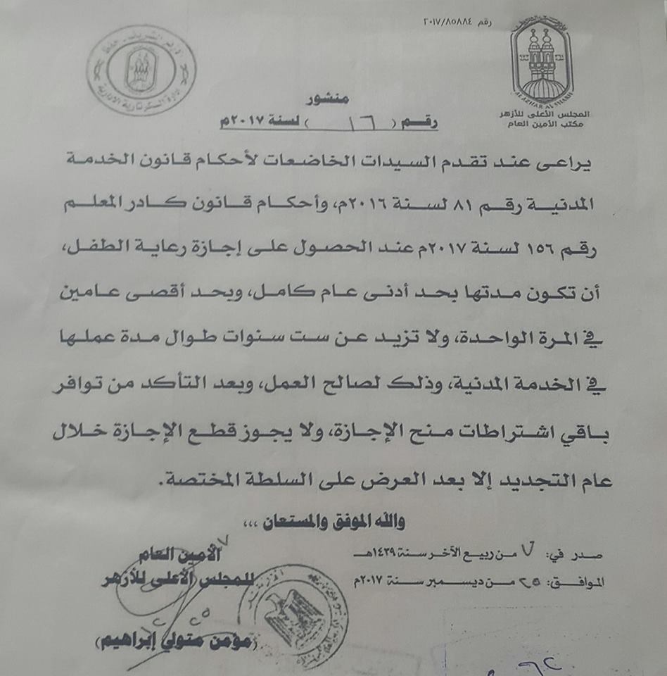 منشور عدم جواز قطع أجازه رعايه الطفل للمدرسات خلال مدة اقل من عام